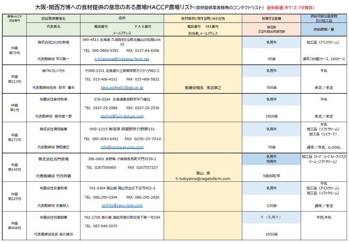 中央畜産会では、本年度において、大阪万博への農場HACCP等の認証を取得した農場の高品質な畜産物の供給を支援する補助事業を実施することとしており、その中で、認証農場に関する各種情報(連絡先、生産・出荷規模、食材提供の意向等)を取りまとめ、マッチング商談会説明会や当会のホームページで食材提供業者向けのコンタクトリストとして情報提供するほか、中央畜産会のホームページにも掲載する予定です。